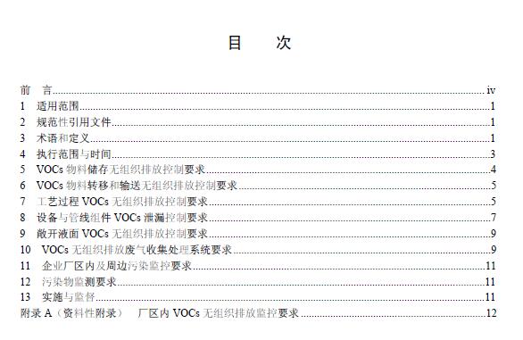 標(biāo)準(zhǔn)規(guī)定了 VOCs物料儲存無組織排放控制要求、VOCs物料轉(zhuǎn)移和輸送無組織排放控制要求、工藝過程 VOCs無組織排放控制要求、設(shè)備與管線組件 VOCs泄漏控制要求、敞開液面 VOCs無組織排放控制要求,以及 VOCs無組織排放廢氣收集處理系統(tǒng)要求、企業(yè)廠區(qū)內(nèi)及周邊污染監(jiān)控要求。
